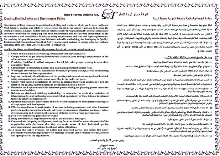 At SinoTharwa Drilling, the safety of employees, customer representatives, and service providers is our greatest responsibility. Sinotharwa Drilling believes that all employees are responsible for working in and creating an environment that results in an incident free work place where no one gets hurt. All employees at Sinotharwa Drilling are given the training, tools and empowerment necessary to be individually responsible for the safety of themselves and their co-workers.